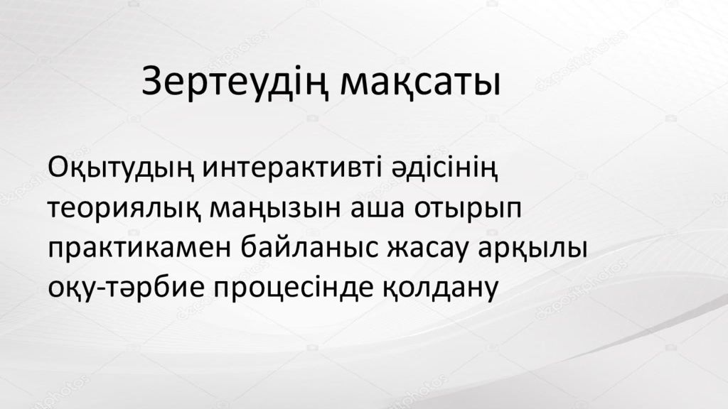 Зертеудің мақсаты Оқытудың интерактивті әдісінің теориялық маңызын аша отырып практикамен байланыс жасау арқылы оқу-тәрбие процесінде қолдану