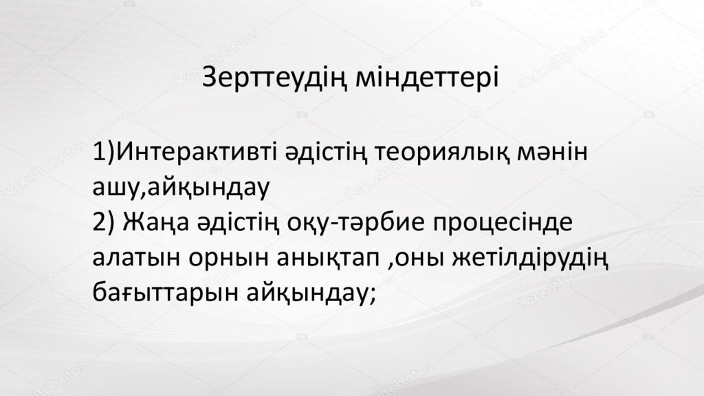 Зерттеудің міндеттері 1 ) Интерактивті әдістің теориялық мәнін ашу,айқындау 2 ) Жаңа әдістің оқу-тәрбие процесінде алатын орнын анықтап,оны жетілдірудің бағыттарын айқындау ;