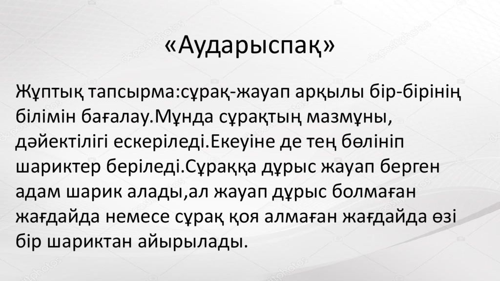 « Аударыспақ » Жұптық тапсырма:сұрақ-жауап арқылы бір-бірінің білімін бағалау.Мұнда сұрақтың мазмұны, дәйектілігі ескеріледі.Екеуіне де тең бөлініп шариктер беріледі.Сұраққа дұрыс жауап берген адам шарик алады,ал жауап дұрыс болмаған жағдайда немесе сұрақ қоя алмаған жағдайда өзі бір шариктан айырылады.