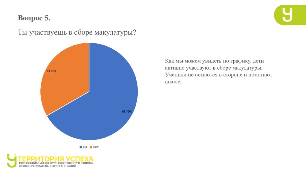 Ты участвуешь в сборе макулатуры? Вопрос 5. Как мы можем увидеть по графику, дети активно участвуют в сборе макулатуры. Ученики не остаются в стороне и помогают школе.