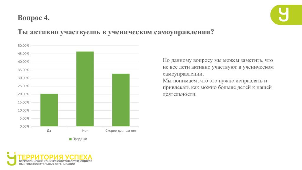 Ты активно участвуешь в ученическом самоуправлении? Вопрос 4. По данному вопросу мы можем заметить, что не все дети активно участвуют в ученическом самоуправлении. Мы понимаем, что это нужно исправлять и привлекать как можно больше детей к нашей деятельности.