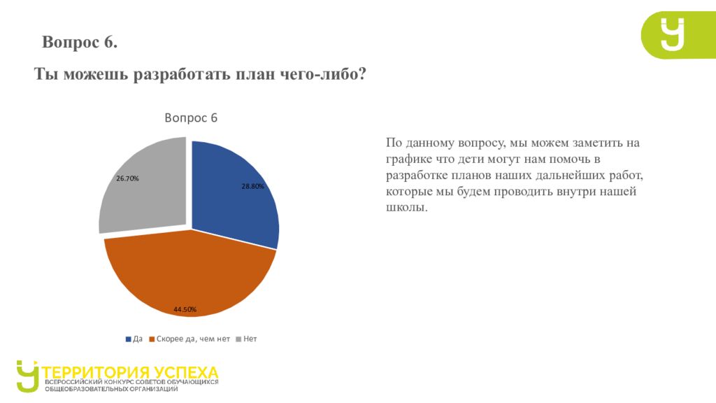 Ты можешь разработать план чего-либо? Вопрос 6. По данному вопросу, мы можем заметить на графике что дети могут нам помочь в разработке планов наших дальнейших работ, которые мы будем проводить внутри нашей школы.