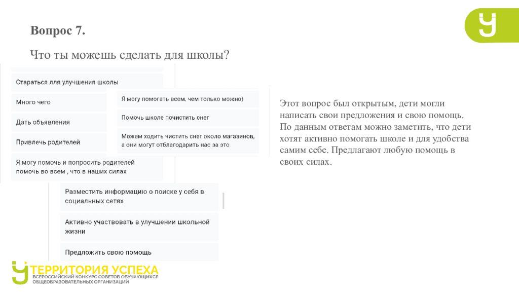 Что ты можешь сделать для школы? Вопрос 7. Этот вопрос был открытым, дети могли написать свои предложения и свою помощь. По данным ответам можно заметить, что дети хотят активно помогать школе и для удобства самим себе. Предлагают любую помощь в своих силах.