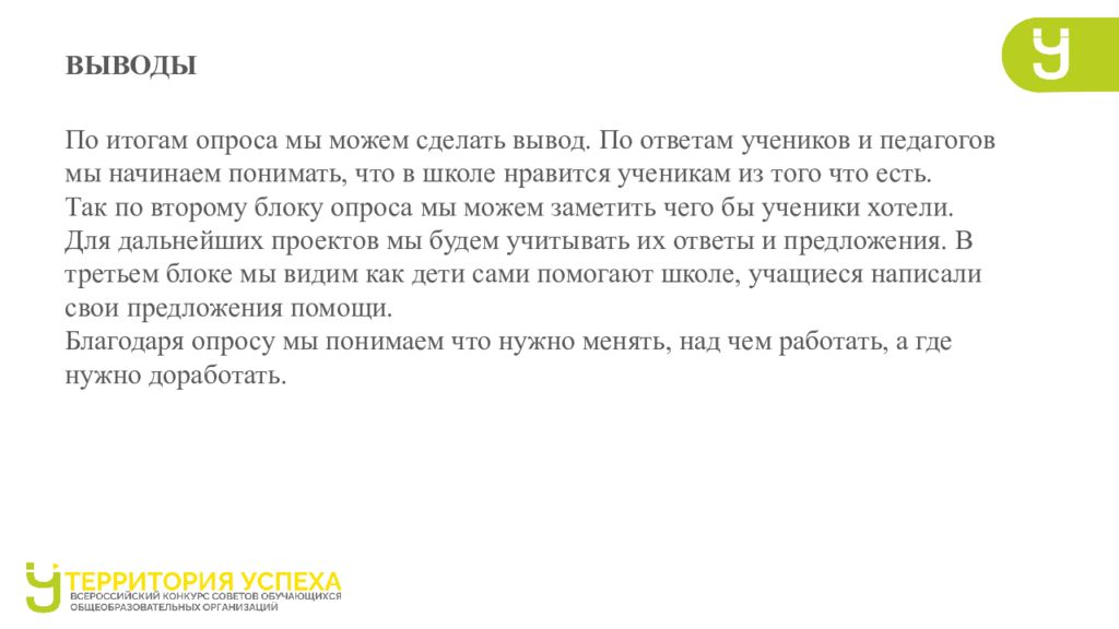 ВЫВОДЫ По итогам опроса мы можем сделать вывод. По ответам учеников и педагогов мы начинаем понимать, что в школе нравится ученикам из того что есть. Так по второму блоку опроса мы можем заметить чего бы ученики хотели. Для дальнейших проектов мы будем учитывать их ответы и предложения. В третьем блоке мы видим как дети сами помогают школе, учащиеся написали свои предложения помощи. Благодаря опросу мы понимаем что нужно менять, над чем работать, а где нужно доработать.