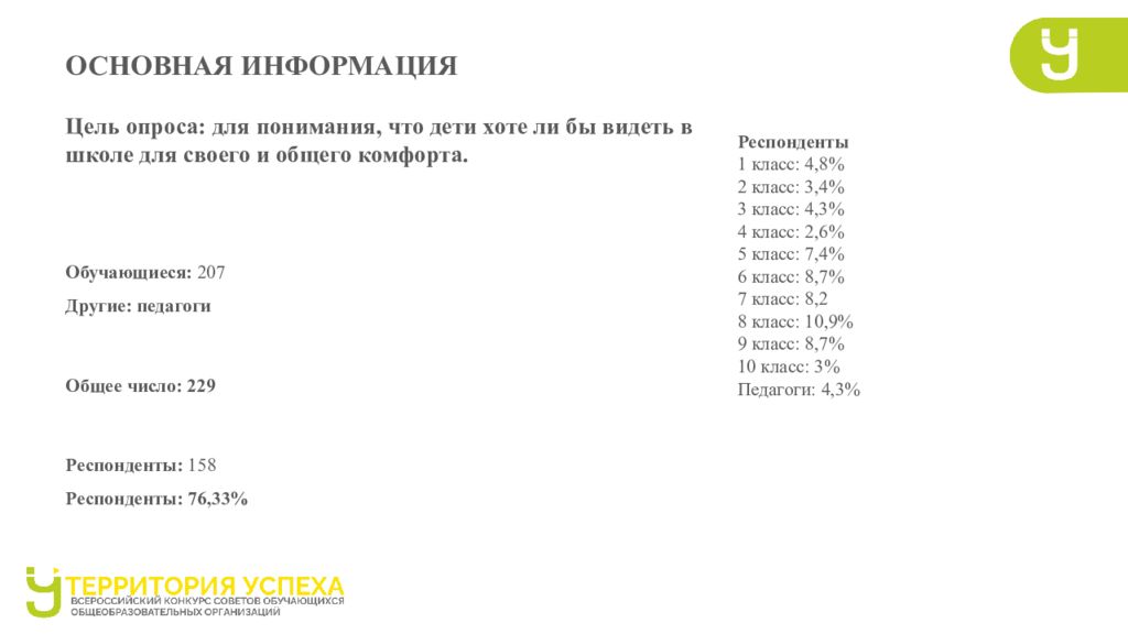 Цель опроса : для понимания, что дети хоте ли бы видеть в школе для своего и общего комфорта. ОСНОВНАЯ ИНФОРМАЦИЯ Обучающиеся: 207 Респонденты : 158 Респонденты : 76,33% Респонденты 1 класс : 4,8% 2 класс : 3,4% 3 класс : 4,3% 4 класс : 2,6% 5 класс : 7,4% 6 класс : 8,7% 7 класс : 8,2 8 класс : 10,9% 9 класс : 8,7% 10 класс : 3% Педагоги : 4,3% Другие: педагоги Общее число : 229