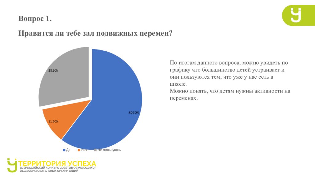 Нравится ли тебе зал подвижных перемен? Вопрос 1. По итогам данного вопроса, можно увидеть по графику что большинство детей устраивает и они пользуются тем, что уже у нас есть в школе. Можно понять, что детям нужны активности на переменах.