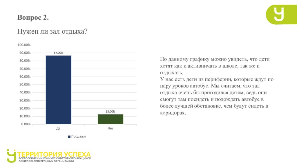 Нужен ли зал отдыха? Вопрос 2. По данному графику можно увидеть, что дети хотят как и активничать в школе, так же и отдыхать. У нас есть дети из периферии, которые ждут по пару уроков автобус. Мы считаем, что зал отдыха очень бы пригодился детям, ведь они смогут там посидеть и подождать автобус в более лучшей обстановке, чем будут сидеть в коридорах.