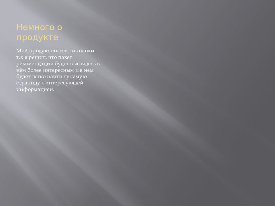Мой продукт состоит из папки т.к я решил, что пакет рекомендаций будет выглядеть в нём более интересным и в нём будет легко найти ту самую страницу с интересующей информацией.