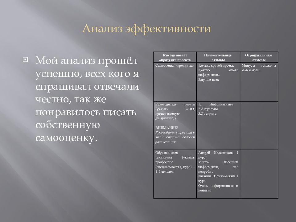 Мой анализ прошёл успешно, всех кого я спрашивал отвечали честно, так же понравилось писать собственную самооценку. Кто оценивает «продукт» проекта Положительные отзывы Отрицательные отзывы Самооценка «продукта». 1,очень крутой проект. 2,очень много информации.. 3,лучше всех Минусы только в математике Руководитель проекта (указать ФИО, преподаваемую дисциплину) ВНИМАНИЕ! Руководитель проекта в этой строчке должен расписаться. Информативно 2.Актуально 3.Доступно Обучающиеся техникума (указать профессию (специальность), курс) – 1-5 человек Андрей Колесников 1 курс: Много полезной информации, всё подробно Филипп Величковский 1 курс: Очень информативно и понятно