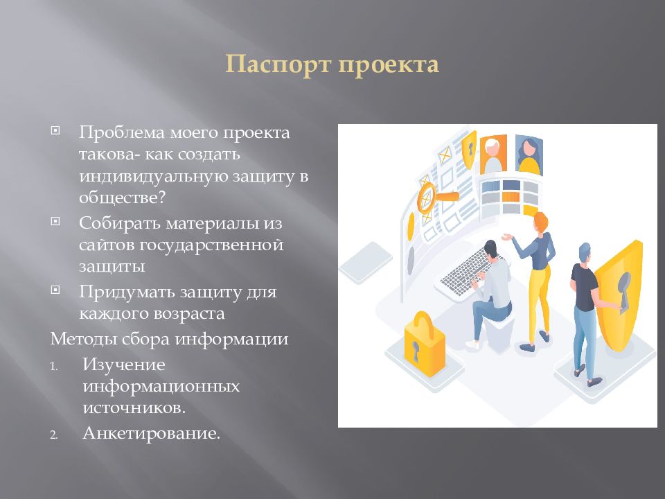 Проблема моего проекта такова- как создать индивидуальную защиту в обществе? Собирать материалы из сайтов государственной защиты Придумать защиту для каждого возраста Методы сбора информации Изучение информационных источников. Анкетирование.