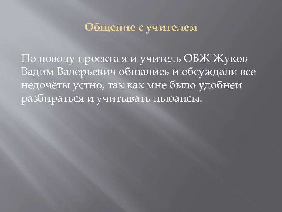 По поводу проекта я и учитель ОБЖ Жуков Вадим Валерьевич общались и обсуждали все недочёты устно, так как мне было удобней разбираться и учитывать ньюансы.