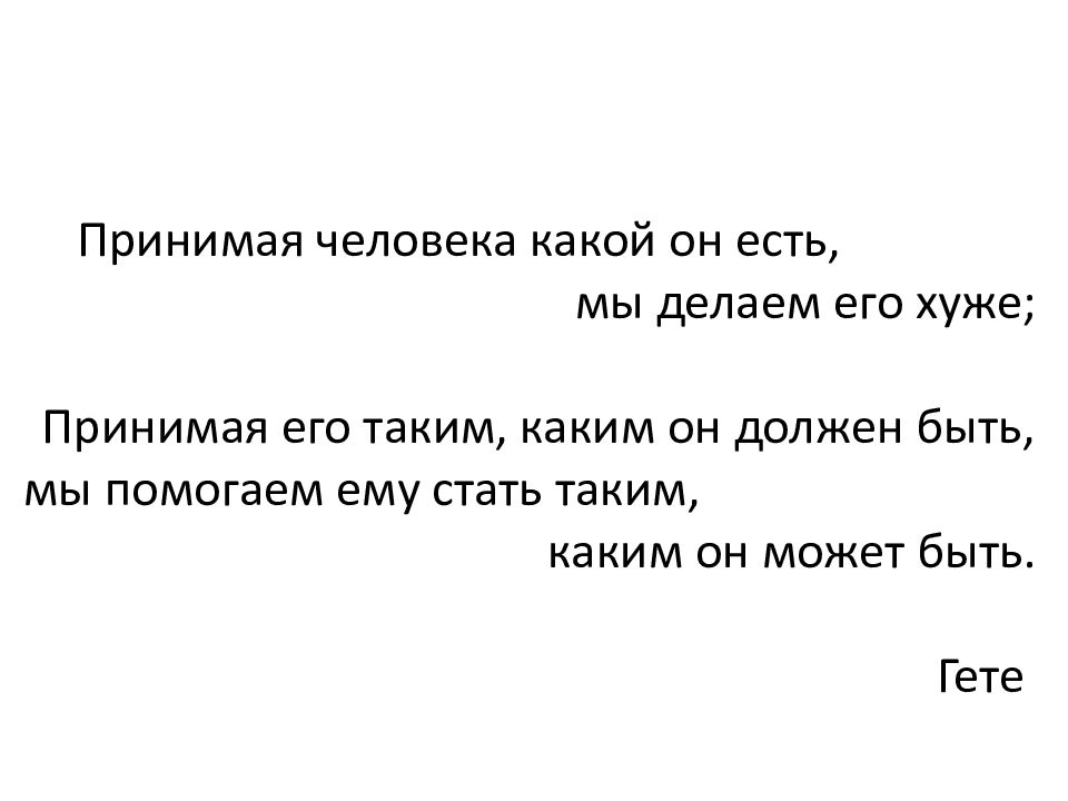 Принимая человека какой он есть, мы делаем его хуже; П ринимая его таким, каким он должен быть, мы помогаем ему стать таким, каким он может быть. Гете