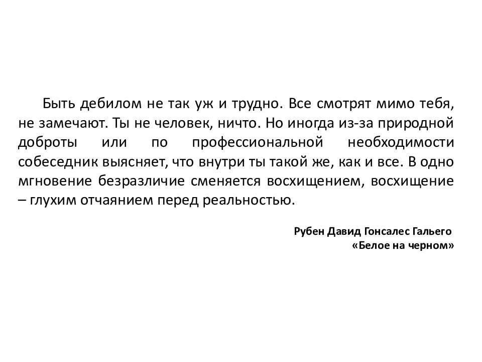 Быть дебилом не так уж и трудно. Все смотрят мимо тебя, не замечают. Ты не человек, ничто. Но иногда из-за природной доброты или по профессиональной необходимости собеседник выясняет, что внутри ты такой же, как и все. В одно мгновение безразличие сменяется восхищением, восхищение – глухим отчаянием перед реальностью. Рубен Давид Гонсалес Гальего «Белое на черном»