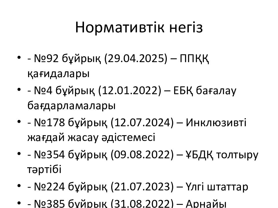 - №92 бұйрық (29.04.2025) – ППҚҚ қағидалары - №4 бұйрық (12.01.2022) – ЕБҚ бағалау бағдарламалары - №178 бұйрық (12.07.2024) – Инклюзивті жағдай жасау әдістемесі - №354 бұйрық (09.08.2022) – ҰБДҚ толтыру тәртібі - №224 бұйрық (21.07.2023) – Үлгі штаттар - №385 бұйрық (31.08.2022) – Арнайы ұйымдар қағидалары