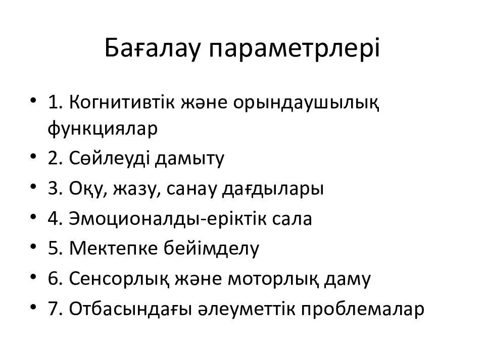 1. Когнитивтік және орындаушылық функциялар 2. Сөйлеуді дамыту 3. Оқу, жазу, санау дағдылары 4. Эмоционалды-еріктік сала 5. Мектепке бейімделу 6. Сенсорлық және моторлық даму 7. Отбасындағы әлеуметтік проблемалар