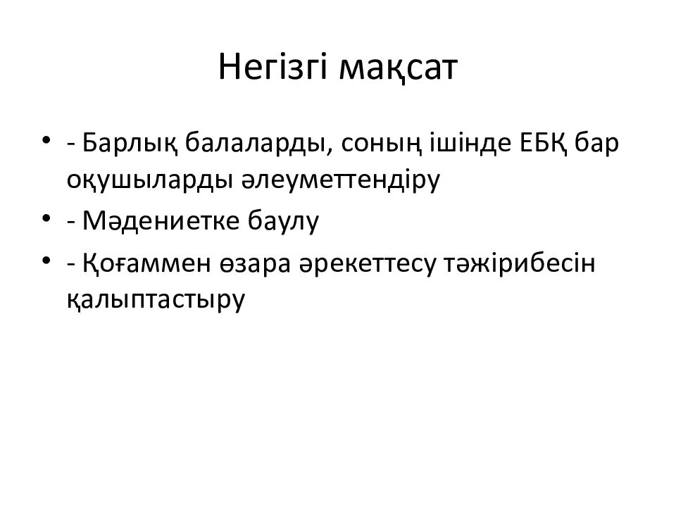 - Барлық балаларды, соның ішінде ЕБҚ бар оқушыларды әлеуметтендіру - Мәдениетке баулу - Қоғаммен өзара әрекеттесу тәжірибесін қалыптастыру