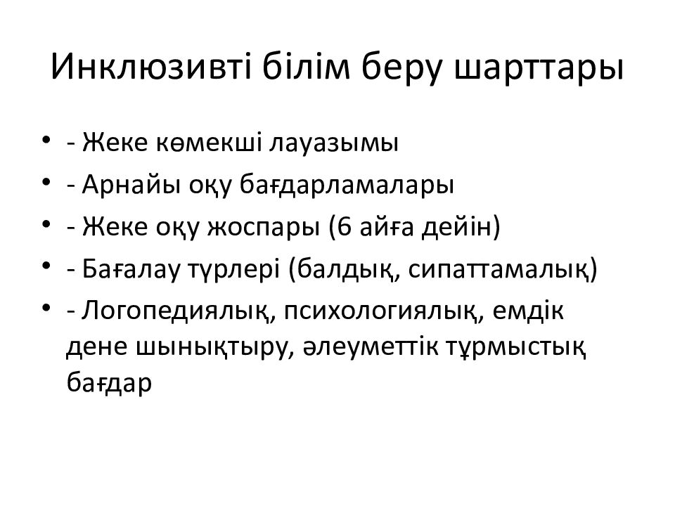 - Жеке көмекші лауазымы - Арнайы оқу бағдарламалары - Жеке оқу жоспары (6 айға дейін) - Бағалау түрлері (балдық, сипаттамалық) - Логопедиялық, психологиялық, емдік дене шынықтыру, әлеуметтік тұрмыстық бағдар