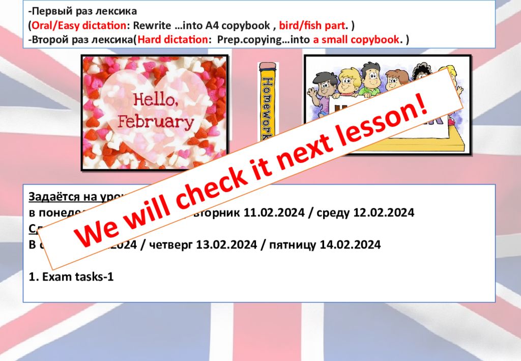 Задаётся на уроке : в понедельник 10.02.2024/ вторник 11.02.2024 / среду 12.02.2024 Сделать на урок: В среду 12.02.2024 / четверг 13.02.2024 / пятницу 14.02.2024 1. Exam tasks-1 - Первый раз лексика ( Oral/Easy dictation : Rewrite …into A4 copybook, bird/fish part. ) -Второй раз лексика( Hard dictation : Prep.copying …into a small copybook. ) We will check it next lesson!