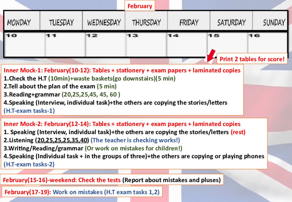 February Inner Mock-1: February(10-12): Tables + stationery + exam papers + laminated copies 1.Check the H.T (10min)+waste baskets(go downstairs)(5 min) 2.Tell about the plan of the exam (5 min) 3.Reading+grammar (20,25,25,45, 45, 60 ) 4.Speaking (Interview, individual task)+the others are copying the stories/letters (H.T-exam tasks-1) Print 2 tables for score! Inner Mock-2: February(12-14): Tables + stationery + exam papers + laminated copies 1. Speaking (Interview, individual task)+the others are copying the stories/letters (rest) 2.Listening ( 20,25,25,25,35,40 ) (The teacher is checking works!) 3.Writing/Reading/grammar (Or work on mistakes for children!) 4.Speaking (Individual task + in the groups of three)+the others are copying or playing phones (H.T-exam tasks-2) February(15-16)-weekend: Check the tests (Report about mistakes and pluses) February(17-19): Work on mistakes (H.T exam tasks 1,2)