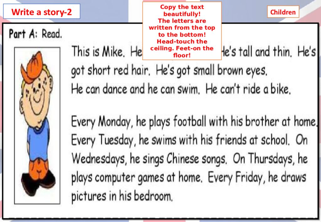 Write a story-2 Copy the text beautifully! The letters are written from the top to the bottom! Head-touch the ceiling. Feet-on the floor! Children
