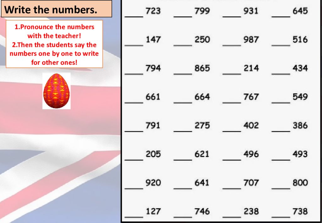 Write the numbers. 1.Pronounce the numbers with the teacher! 2.Then the students say the numbers one by one to write for other ones!