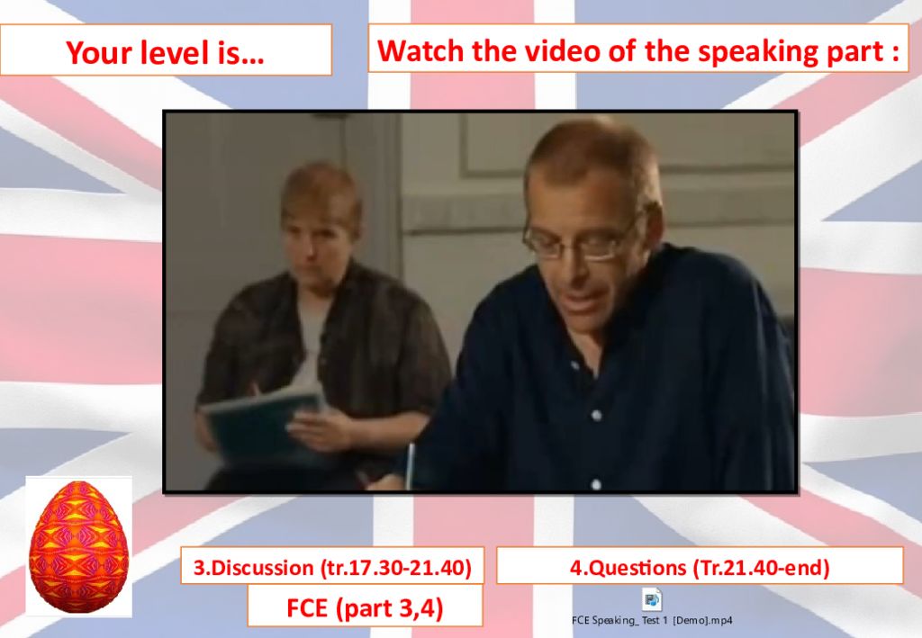 Watch the video of the speaking part : Your level is… FCE (part 3,4) 3.Discussion (tr.17.30-21.40) 4.Questions (Tr.21.40-end)