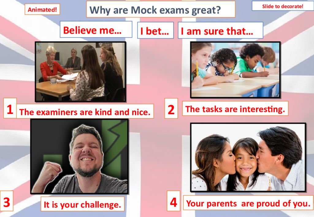 Why are Mock exams great? Slide to decorate! Believe me… I am sure that… I bet… 1 2 3 4 Animated! The examiners are kind and nice. The tasks are interesting. It is your challenge. Your parents are proud of you.