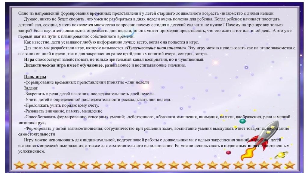 Одно из направлений формирования временных представлений у детей старшего дошкольного возраста -знакомство с днями недели. Думаю, никто не будет спорить, что умение разбираться в днях недели очень полезно для ребенка. Когда ребенок начинает посещать детский сад, секции, у него появляется множество вопросов: почему сегодня в детский сад идти не нужно? Почему на тренировку только завтра? Если научится дошкольник определять дни недели, то он сможет примерно представлять, что его ждет в тот или иной день. А это уже первый шаг на пути к планированию собственного времени. Как известно, дети усваивают любую информацию лучше всего, когда она подается в игре. Для этого мы разработали игру, которое называется « Путешествие инопланетян ». Эту игру можно использовать как на этапе знакомства с названиями дней недели, так и для закрепления ранее пройденных понятий вчера, сегодня, завтра. Игра способствует задействовать не только зрительный канал восприятия, но и чувственный. Дидактическая игра имеет обучающее, развивающее и воспитывающие значение. Цель игры : -формирование временных представлений (понятие «дни недели Задачи : -Закрепить в речи детей названия, последовательность дней недели. -Учить детей в определенной последовательности раскладывать дни недели. -Продолжать учить порядковому счету. -Развивать внимание, память, мышление -Способствовать формированию сенсорных умений; -действенного, образного мышления, внимания, памяти, воображения, речи и мелкой моторики рук; -Формировать у детей взаимоотношения, сотрудничество при решении задач, воспитание умения выслушать ответ товарища, воспитание самостоятельности Игру можно использовать для индивидуальной, подгрупповой работы с дошкольниками с целью закрепления знаний и умению детей выполнять определённые задания, а также для самостоятельного использования. Ее можно использовать в подвижных играх с постепенным усложнением.
