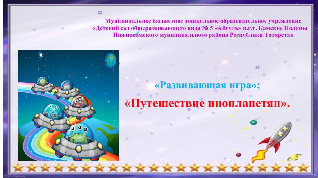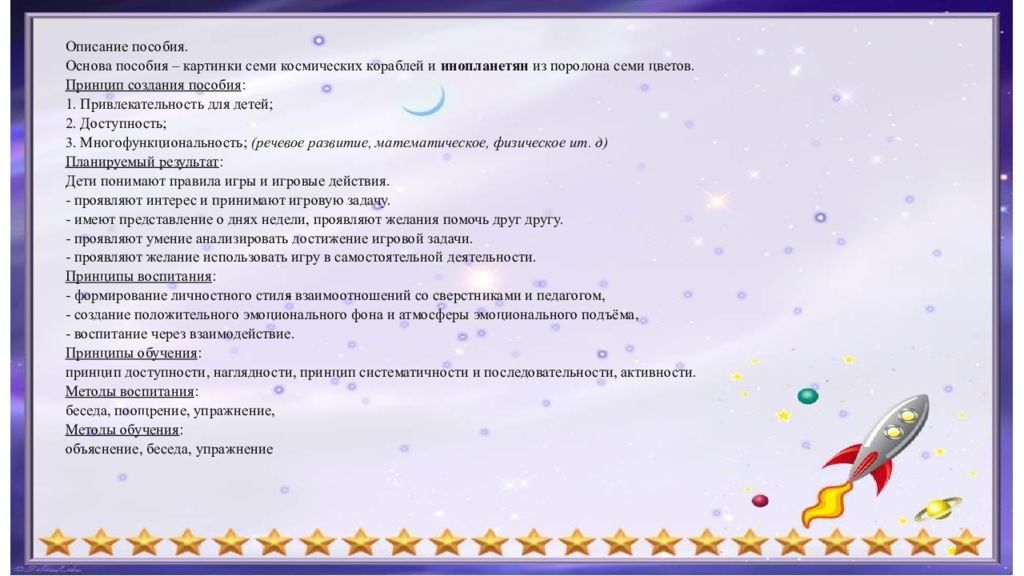 - Описание пособия. Основа пособия – картинки семи космических кораблей и инопланетян из поролона семи цветов. Принцип создания пособия : 1. Привлекательность для детей; 2. Доступность; 3. Многофункциональность; (речевое развитие, математическое, физическое ит. д) Планируемый результат : Дети понимают правила игры и игровые действия. - проявляют интерес и принимают игровую задачу. - имеют представление о днях недели, проявляют желания помочь друг другу. - проявляют умение анализировать достижение игровой задачи. - проявляют желание использовать игру в самостоятельной деятельности. Принципы воспитания : - формирование личностного стиля взаимоотношений со сверстниками и педагогом, - создание положительного эмоционального фона и атмосферы эмоционального подъёма, - воспитание через взаимодействие. Принципы обучения : принцип доступности, наглядности, принцип систематичности и последовательности, активности. Методы воспитания : беседа, поощрение, упражнение, Методы обучения : объяснение, беседа, упражнение
