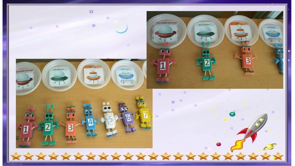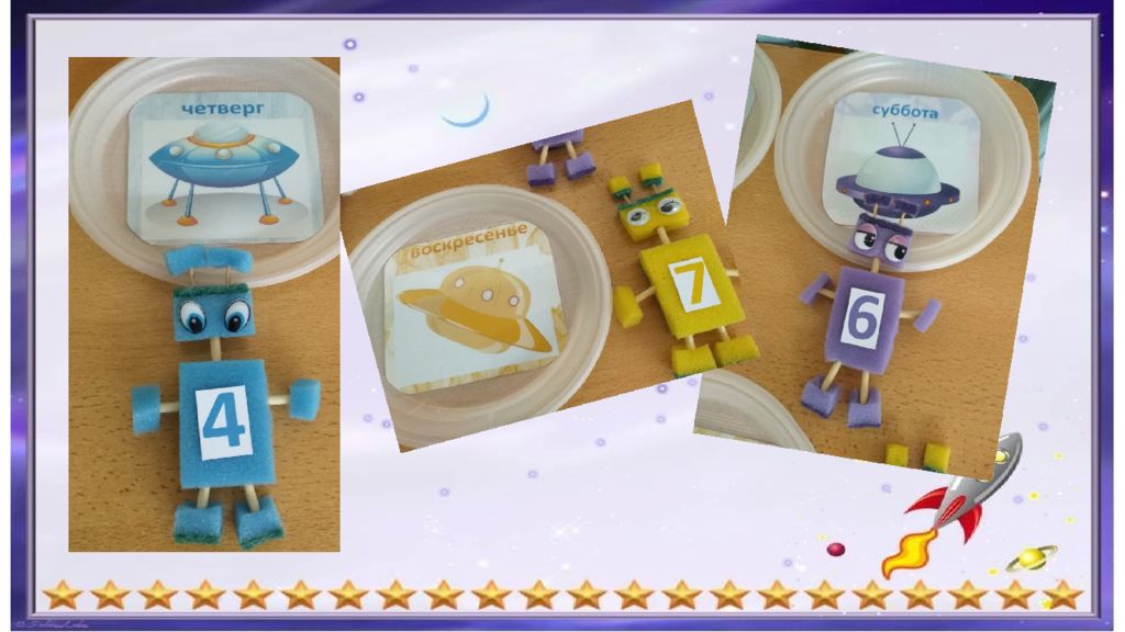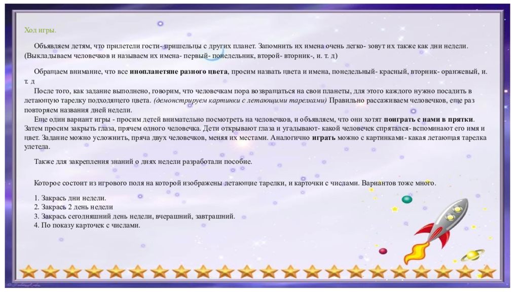 Ход игры. Объявляем детям, что прилетели гости- пришельцы с других планет. Запомнить их имена очень легко- зовут их также как дни недели. (Выкладываем человечков и называем их имена- первый- понедельник, второй- вторник-, и. т. д) Обращаем внимание, что все инопланетяне разного цвета, просим назвать цвета и имена, понедельный- красный, вторник- оранжевый, и. т. д После того, как задание выполнено, говорим, что человечкам пора возвращаться на свои планеты, для этого каждого нужно посадить в летающую тарелку подходящего цвета. (демонстрируем картинки с летающими тарелками) Правильно рассаживаем человечков, еще раз повторяем названия дней недели. Еще один вариант игры - просим детей внимательно посмотреть на человечков, и объявляем, что они хотят поиграть с нами в прятки. Затем просим закрыть глаза, прячем одного человечка. Дети открывают глаза и угадывают- какой человечек спрятался- вспоминают его имя и цвет. Задание можно усложнить, пряча двух человечков, меняя их местами. Аналогично играть можно с картинками- какая летающая тарелка улетела. Также для закрепления знаний о днях недели разработали пособие. Которое состоит из игрового поля на которой изображены летающие тарелки, и карточки с числами. Вариантов тоже много. 1. Закрась дни недели. 2. Закрась 2 день недели 3. Закрась сегодняшний день недели, вчерашний, завтрашний. 4. По показу карточек с числами.