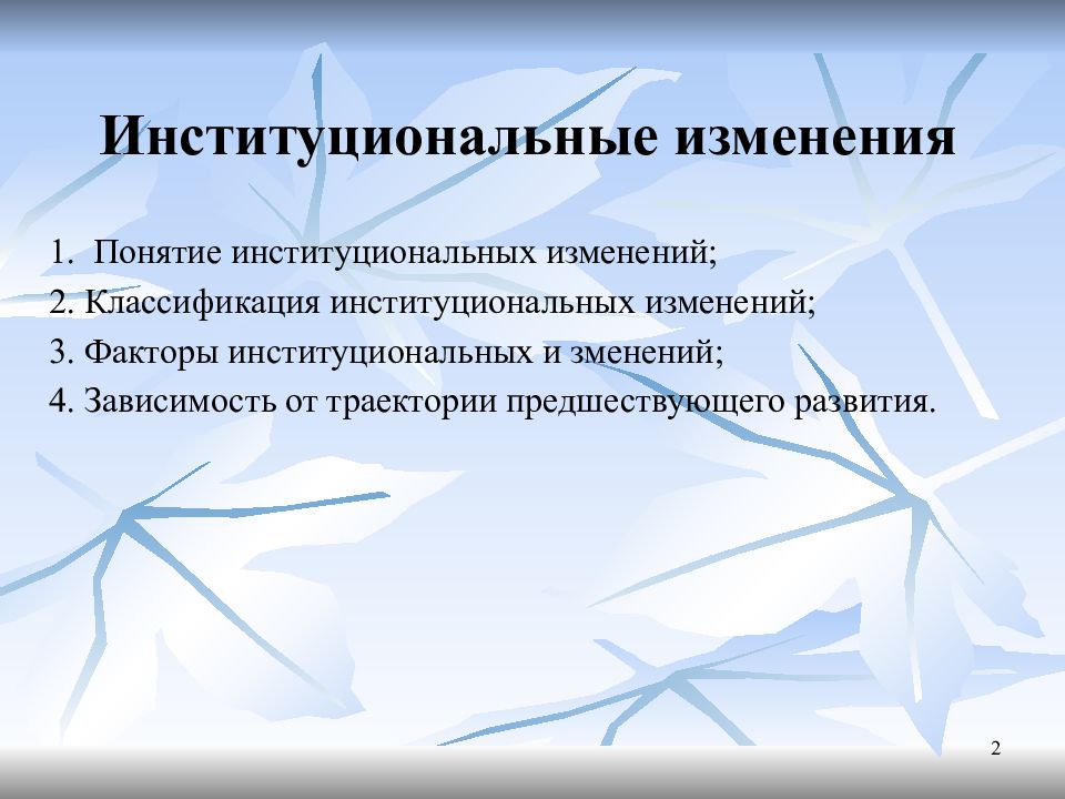 1. Понятие институциональных изменений; 2. Классификация институциональных изменений; 3. Факторы институциональных и зменений; 4. Зависимость от траектории предшествующего развития. 2