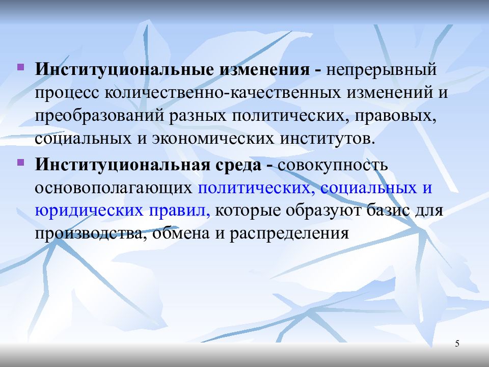 Институциональные изменения - непрерывный процесс количественно-качественных изменений и преобразований разных политических, правовых, социальных и экономических институтов. Институциональная среда - совокупность основополагающих политических, социальных и юридических правил, которые образуют базис для производства, обмена и распределения 5