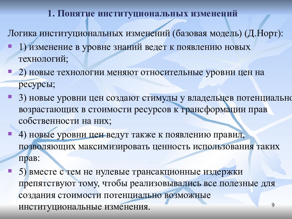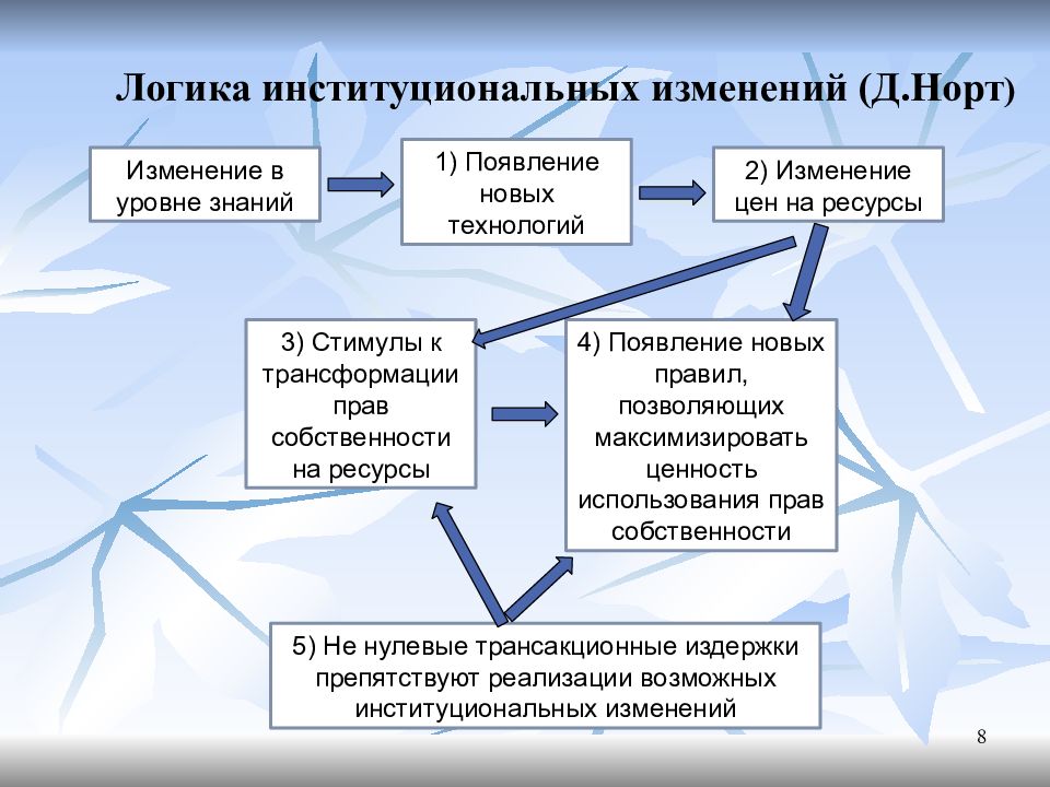 Логика институциональных изменений (базовая модель) ( Д.Норт ): 1) изменение в уровне знаний ведет к появлению новых технологий; 2) новые технологии меняют относительные уровни цен на ресурсы; 3) новые уровни цен создают стимулы у владельцев потенциально возрастающих в стоимости ресурсов к трансформации прав собственности на них; 4) новые уровни цен ведут также к появлению правил, позволяющих максимизировать ценность использования таких прав: 5) вместе с тем не нулевые трансакционные издержки препятствуют тому, чтобы реализовывались все полезные для создания стоимости потенциально возможные институциональные изменения. 9