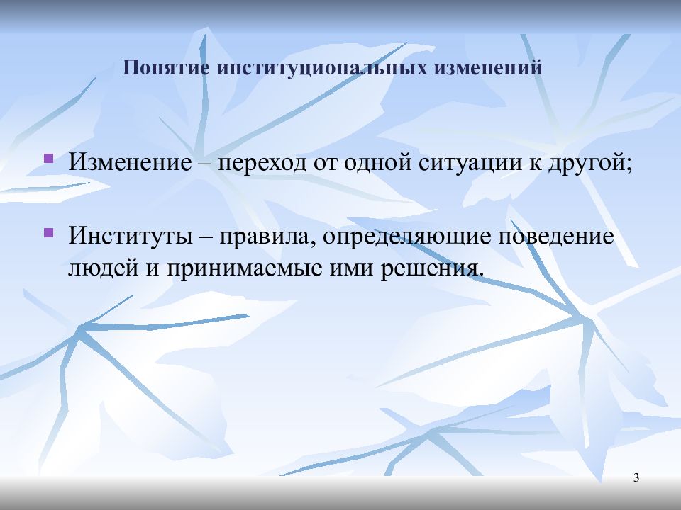 Изменение – переход от одной ситуации к другой; Институты – правила, определяющие поведение людей и принимаемые ими решения. 3