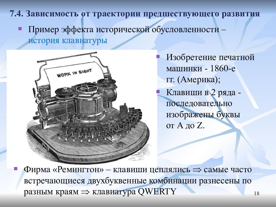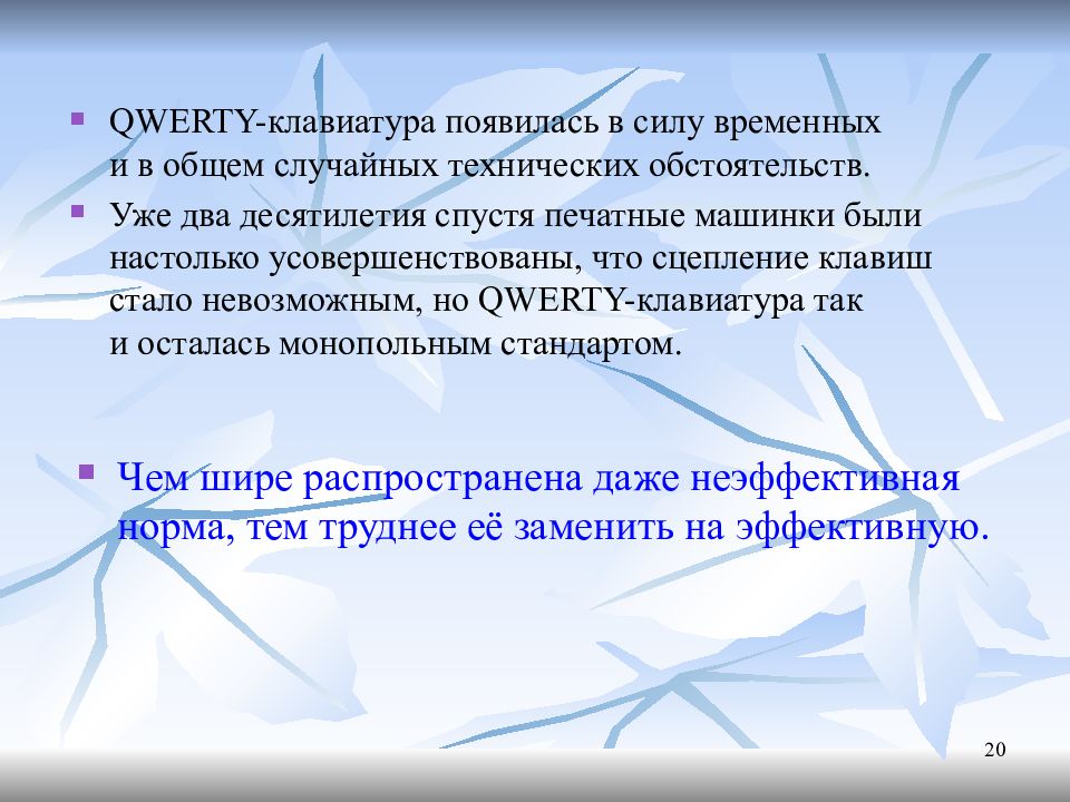 QWERTY-клавиатура появилась в силу временных и в общем случайных технических обстоятельств. Уже два десятилетия спустя печатные машинки были настолько усовершенствованы, что сцепление клавиш стало невозможным, но QWERTY-клавиатура так и осталась монопольным стандартом. 20 Чем шире распространена даже неэффективная норма, тем труднее её заменить на эффективную.