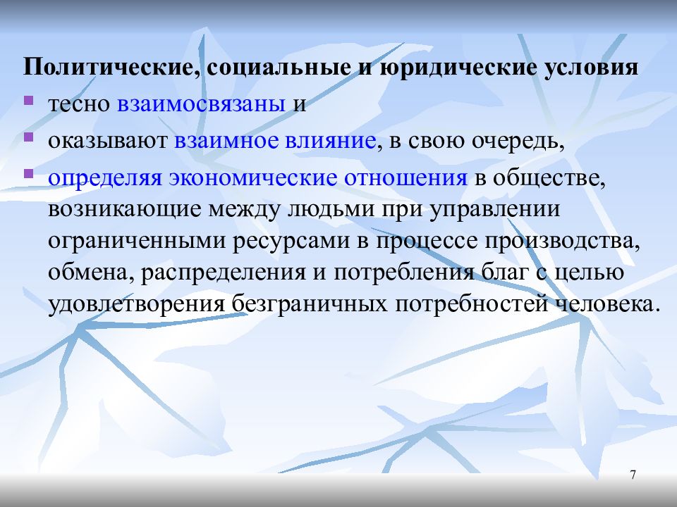 Политические, социальные и юридические условия тесно взаимосвязаны и оказывают взаимное влияние, в свою очередь, определяя экономические отношения в обществе, возникающие между людьми при управлении ограниченными ресурсами в процессе производства, обмена, распределения и потребления благ с целью удовлетворения безграничных потребностей человека. 7