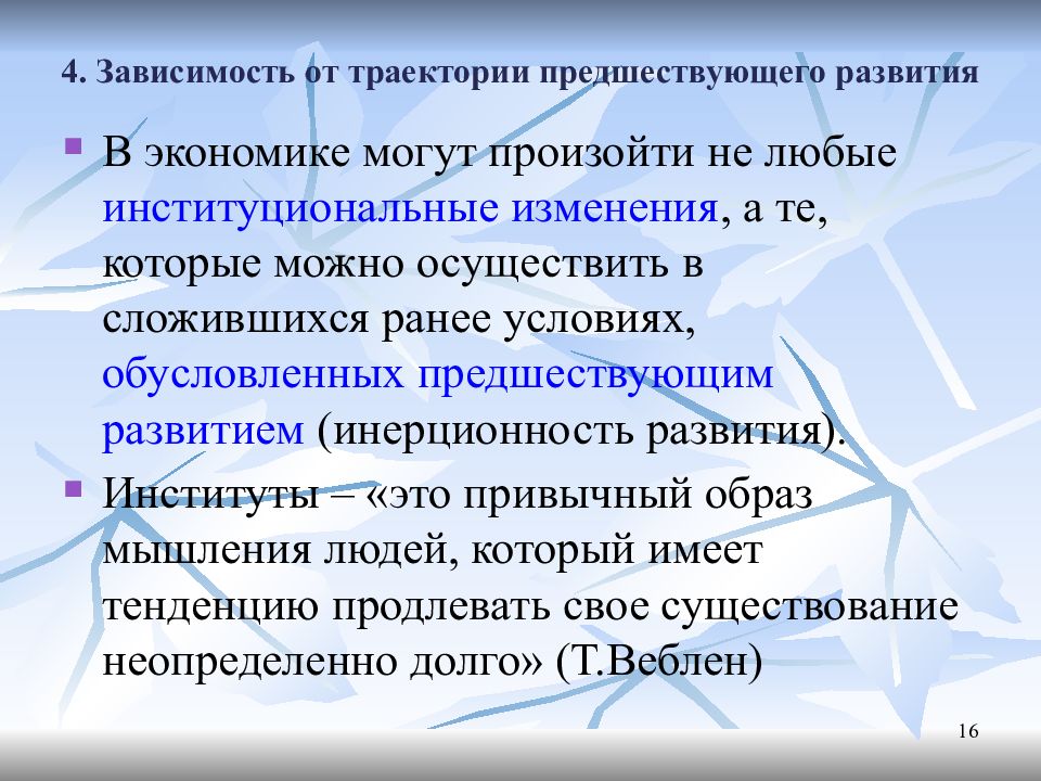 В экономике могут произойти не любые институциональные изменения, а те, которые можно осуществить в сложившихся ранее условиях, обусловленных предшествующим развитием (инерционность развития). Институты – «это привычный образ мышления людей, который имеет тенденцию продлевать свое существование неопределенно долго» ( Т.Веблен ) 16