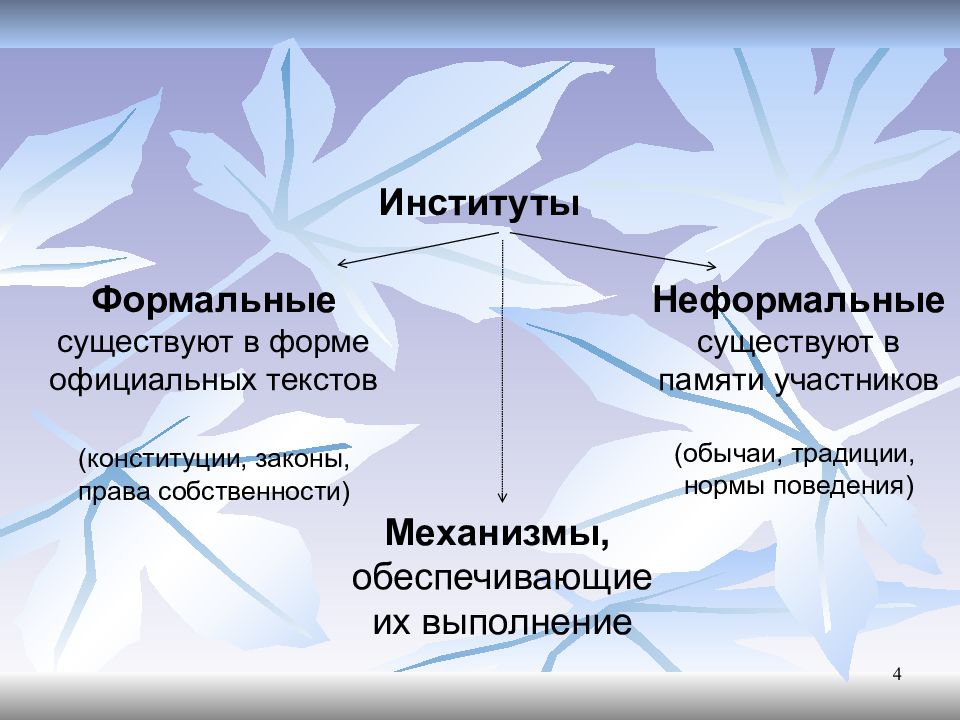 4 Институты Формальные существуют в форме официальных текстов (конституции, законы, права собственности) Механизмы, обеспечивающие их выполнение Неформальные существуют в памяти участников (обычаи, традиции, нормы поведения)