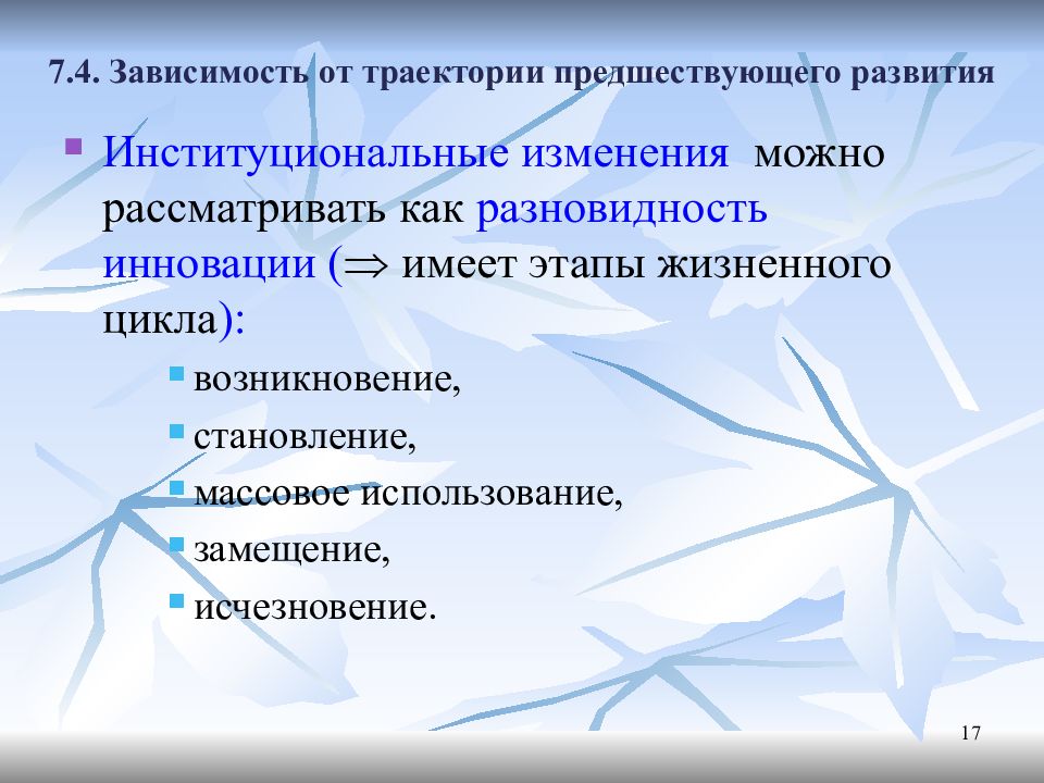 Слайд 17: 7.4. Зависимость от траектории предшествующего развития