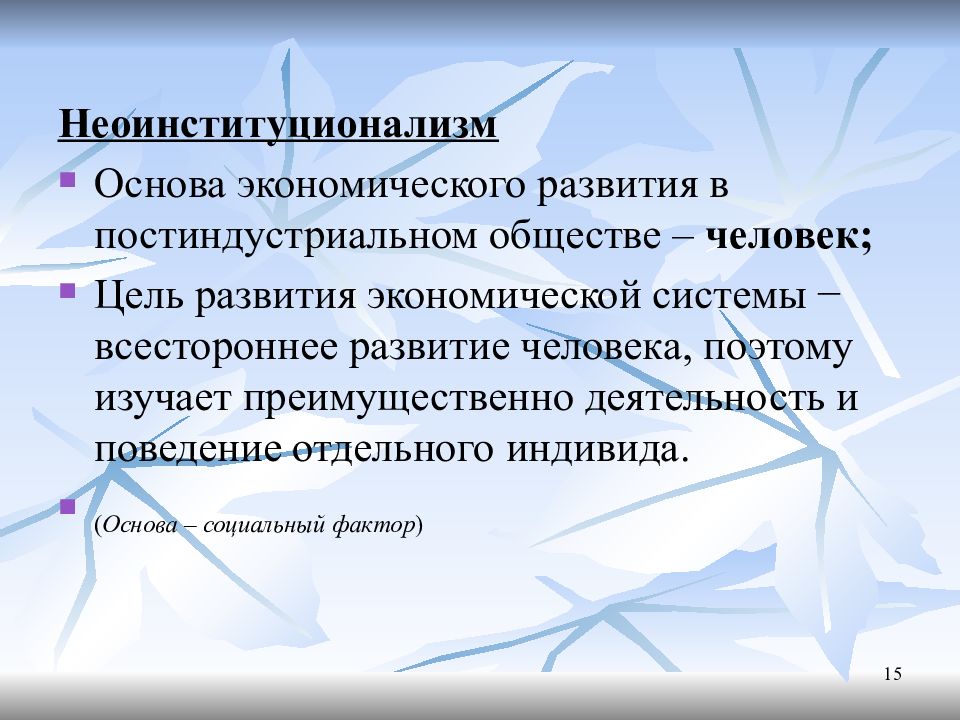 Неоинституционализм Основа экономического развития в постиндустриальном обществе – человек; Цель развития экономической системы − всестороннее развитие человека, поэтому изучает преимущественно деятельность и поведение отдельного индивида. ( Основа – социальный фактор ) 15