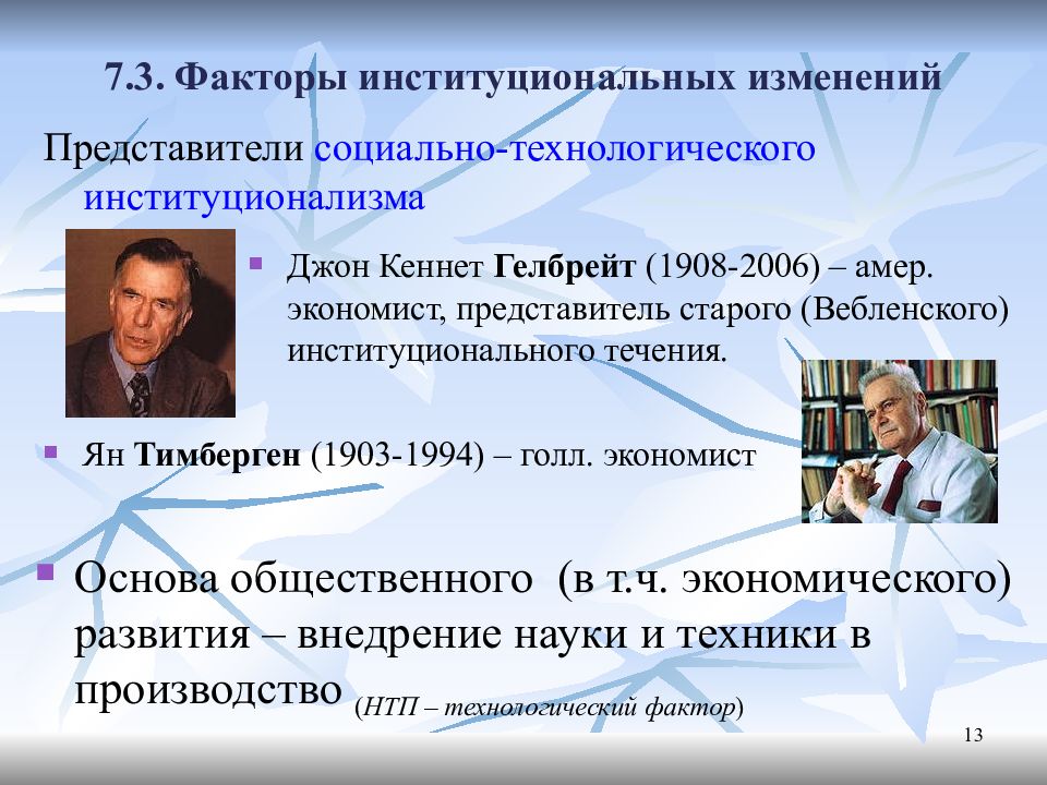 Представители социально-технологического институционализма 13 Джон Кеннет Гелбрейт (1908-2006) – амер. экономист, представитель старого ( Вебленского ) институционального течения. Основа общественного (в т.ч. экономического) развития – внедрение науки и техники в производство ( НТП – технологический фактор ) Ян Тимберген (1903-1994) – голл. экономист