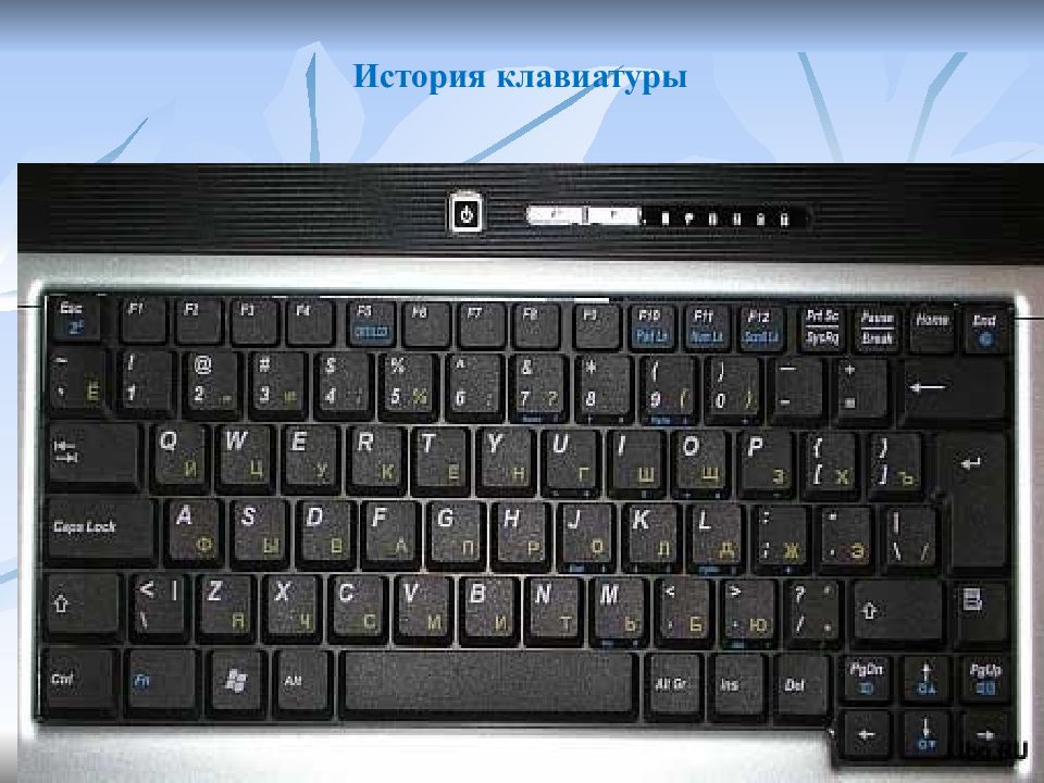 Пример эффекта исторической обусловленности – история клавиатуры 18 Изобретение печатной машинки - 1860-е гг. (Америка); Клавиши в 2 ряда - последовательно изображены буквы от A до Z. Фирма «Ремингтон» – клавиши цеплялись самые часто встречающиеся двухбуквенные комбинации разнесены по разным краям клавиатура QWERTY