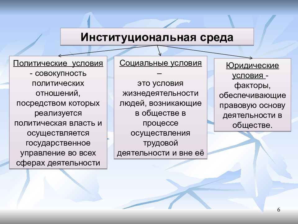 6 Институциональная среда Политические условия - совокупность политических отношений, посредством которых реализуется политическая власть и осуществляется государственное управление во всех сферах деятельности Социальные условия – это условия жизнедеятельности людей, возникающие в обществе в процессе осуществления трудовой деятельности и вне её Юридические условия - факторы, обеспечивающие правовую основу деятельности в обществе.