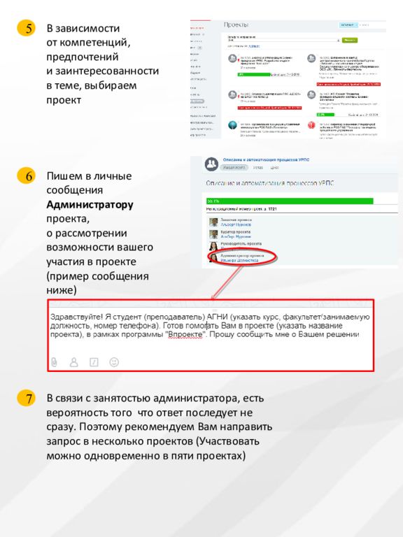 5 В зависимости от компетенций, предпочтений и заинтересованности в теме, выбираем проект 6 Пишем в личные сообщения Администратору проекта, о рассмотрении возможности вашего участия в проекте ( пример сообщения ниже) 7 В связи с занятостью администратора, есть вероятность того что ответ последует не сразу. Поэтому рекомендуем Вам направить запрос в несколько проектов (Участвовать можно одновременно в пяти проектах)