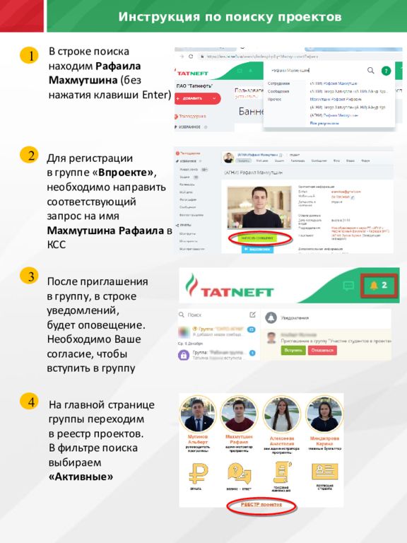 1 В строке поиска находим Рафаила Махмутшина (без нажатия клавиши Enter) 2 Для регистрации в группе « Впроекте», необходимо направить соответствующий запрос на имя Махмутшина Рафаила в КСС Инструкция по поиску проектов 3 После приглашения в группу, в строке уведомлений, будет оповещение. Необходимо Ваше согласие, чтобы вступить в группу 4 На главной странице группы переходим в реестр проектов. В фильтре поиска выбираем «Активные»