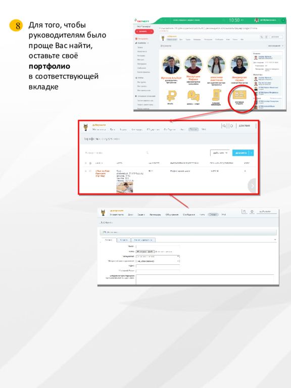 Для того, чтобы руководителям было проще Вас найти, оставьте своё портфолио в соответствующей вкладке 8