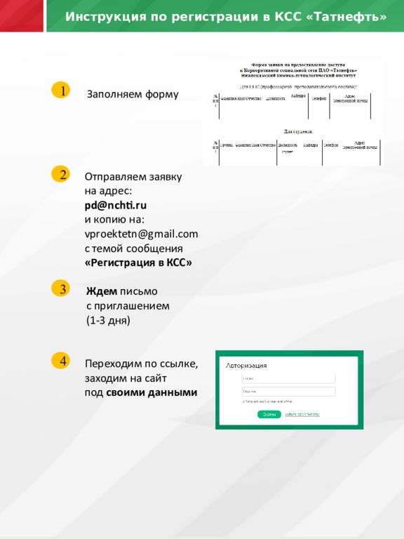 Инструкция по регистрации в КСС «Татнефть» 1 Заполняем форму 2 Отправляем заявку на адрес : pd@nchti.r u и копию на: vproektetn@gmail.com с темой сообщения «Регистрация в КСС» 3 Ждем письмо с приглашением (1-3 дня) Переходим по ссылке, заходим на сайт под своими данными 4
