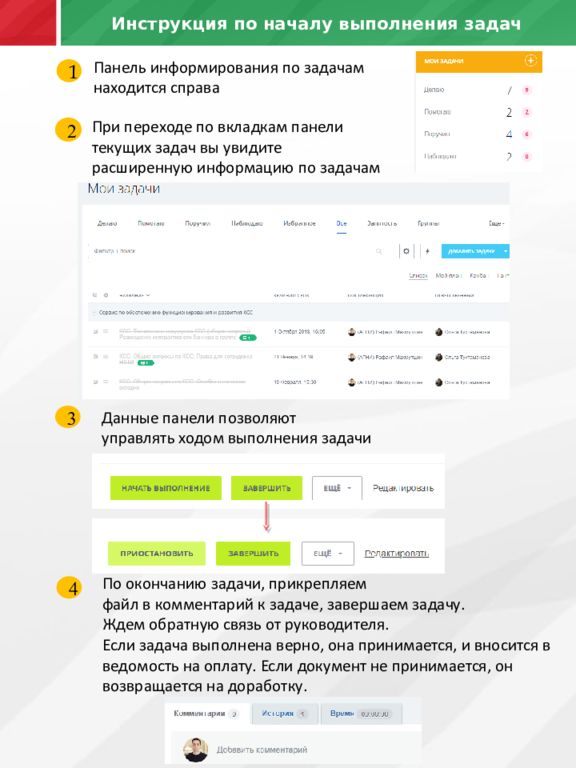 Инструкция по началу выполнения задач 1 Панель информирования по задачам н аходится справа 2 При переходе по вкладкам панели текущих задач вы увидите расширенную информацию по задачам 3 Данные панели позволяют управлять ходом выполнения задачи По окончанию задачи, прикрепляем файл в комментарий к задаче, завершаем задачу. Ждем обратную связь от руководителя. Если задача выполнена верно, она принимается, и вносится в ведомость на оплату. Если документ не принимается, он возвращается на доработку. 4