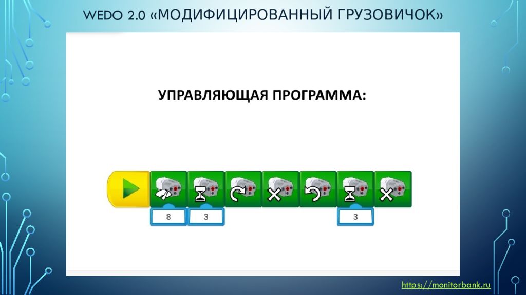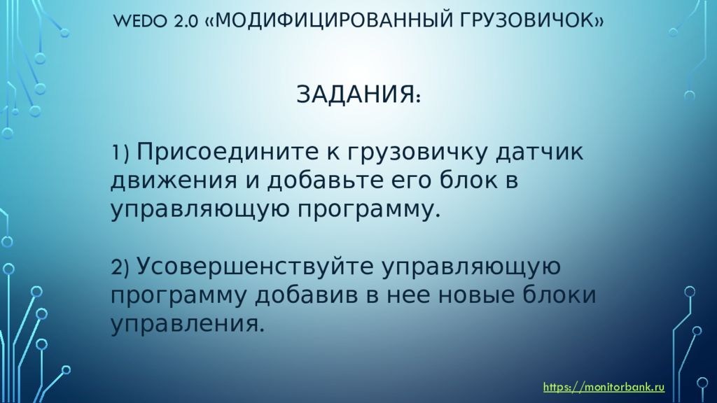 ЗАДАНИЯ: 1) Присоедините к грузовичку датчик движения и добавьте его блок в управляющую программу. 2 ) Усовершенствуйте управляющую программу добавив в нее новые блоки управления. https://monitorbank.ru