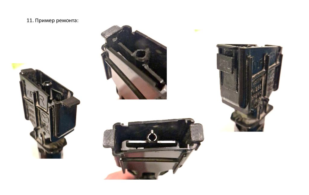 1. Сделать вырез в корпусе форсунки по размерам, как показано на картинке красной пунктирной линией *. 2. Установить ремонтное ушко в сделанный вырез, доработать вырез если необходимо так, чтобы ушко вставало без зазоров и заподлицо с корпусом в верхней части и с боку. Заподлицо с корпусом Вырез Ремонт «Жесткого» ушка Без зазора 1.6 мм 3 мм 8,5 мм *можно, предварительно приложив ушко к корпусу в нужном положении, очертить контур будущего выреза. Вид снаружи Вид изнутри